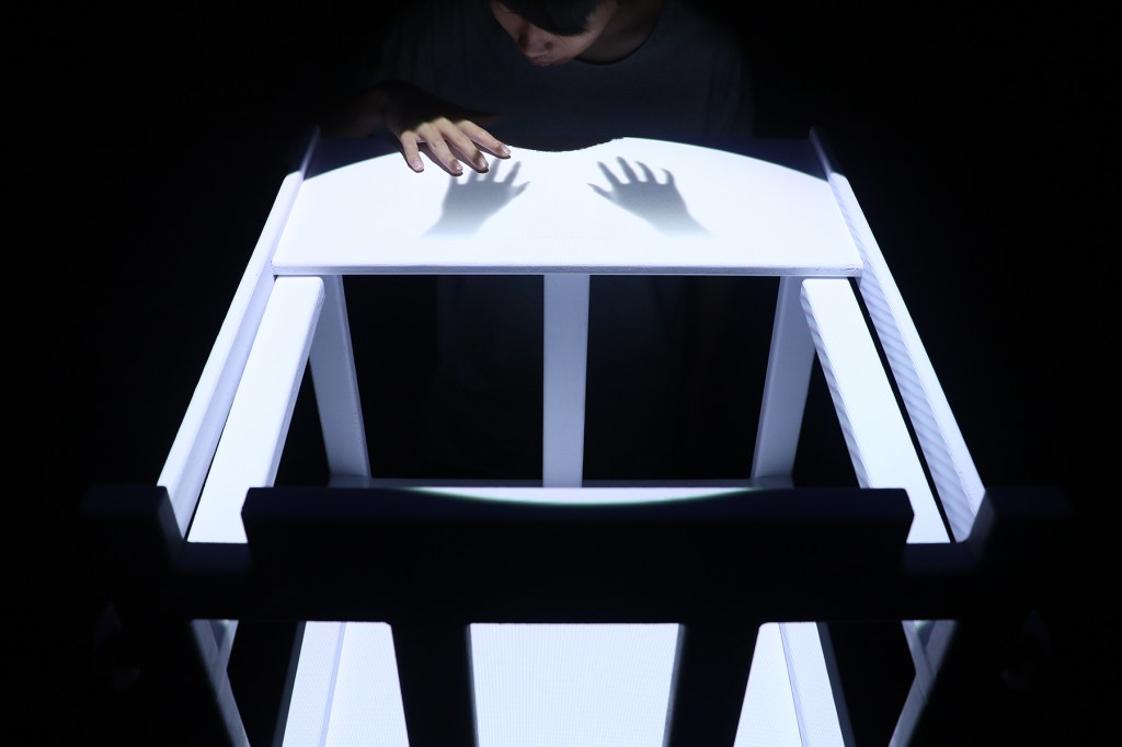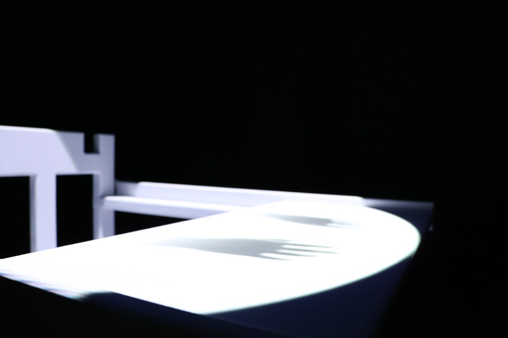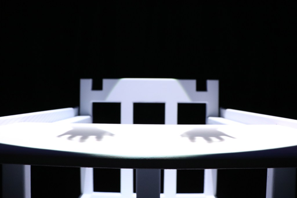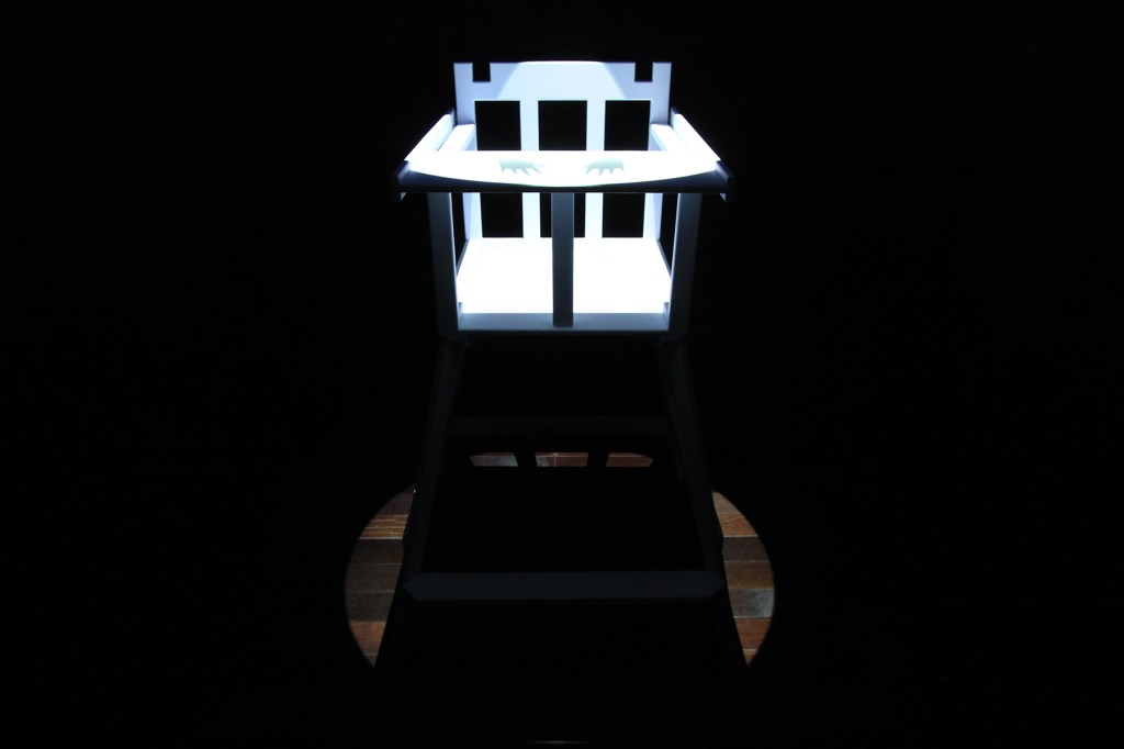 狹小並挑高的空間,投影機的光像是劇場的spot light一樣打在正中間的兒童椅上,以一種劇場聚焦的形式呈現,細看餐盤上微微動著的一雙手,暗示著似乎有一個人正束縛在其中,配合整個空間的視覺,營造著一種不安、詭譎的氣氛。試圖用空間的畫面去打破一般對兒童椅安全、溫暖的印象,而是更不安與冰冷的,讓一般對家庭的想像轉為孤單和寂寞。刻意以投影機的光去模仿一般的劇場燈,讓投影機投出不單單只是畫面,去做一些對於投影機本身新的嘗試。