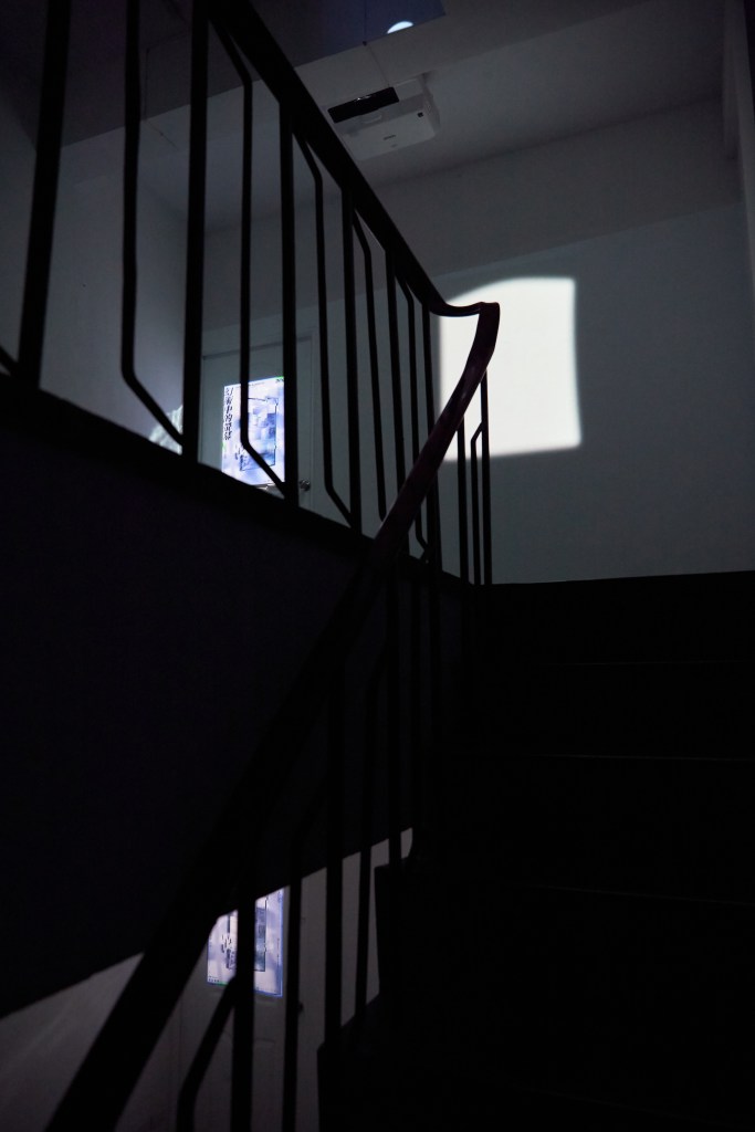 This experiment connects the two floors through imagery, while the term “樓中樓" metaphorically mirrors the interplay between illusion and reality. The work delves into how viewers engage with the piece and how the imagery is integrated within the space. By shifting the audience’s movement from horizontal to vertical, the installation elevates the dimensionality of the image within the space. It offers an alternate bodily experience, encouraging a deeper spatial perception of the image’s presence.